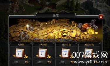 此外,这款游戏里还加入了一个比较有趣的货币化系统,也就是金库存款的做法。按照玩家选择的金币存入天数,金库会产出更高的利息,比如30天可以有50%的利息,这一点和国内这两年非常热的P2P金融概念很类似,也是绝大多数SLG手游里都没有的做法。