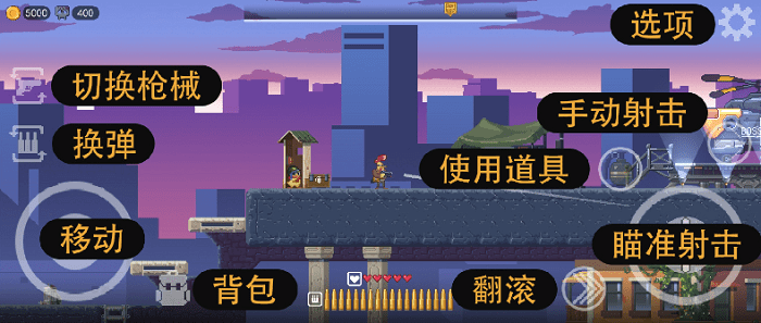 3、正式开始后左边控制角色的移动,右边控制角色的射击、冲刺和使用道具。