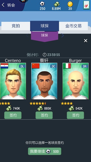 如果说球探搜索到的球员是种子球员后期有培养的天赋,那么经纪人签约来的球员就是夺目的球星。拥有强大的个人能力以及独有的技能,他们可能是我们足球帝国里的梅西或C罗。但好的球员肯定需要付出不小的成本,金币+正常签约费对一般玩家来说还是很高的。