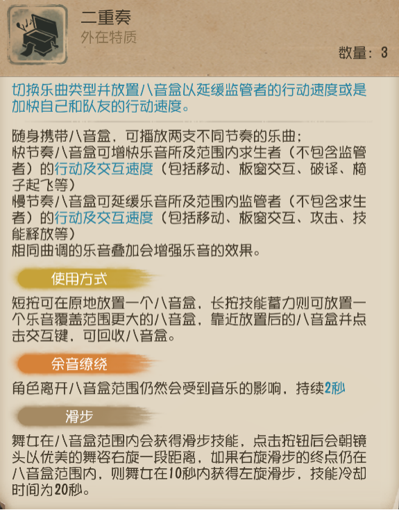 ★实战注意:合理运用八音盒是牵制监管者的关键,八音盒的放置位置和八音盒所带来的加速或减速效果,再配合上【滑步】,能够有效增加自身牵制时长,同时还能够用来辅助队友去牵制监管者。