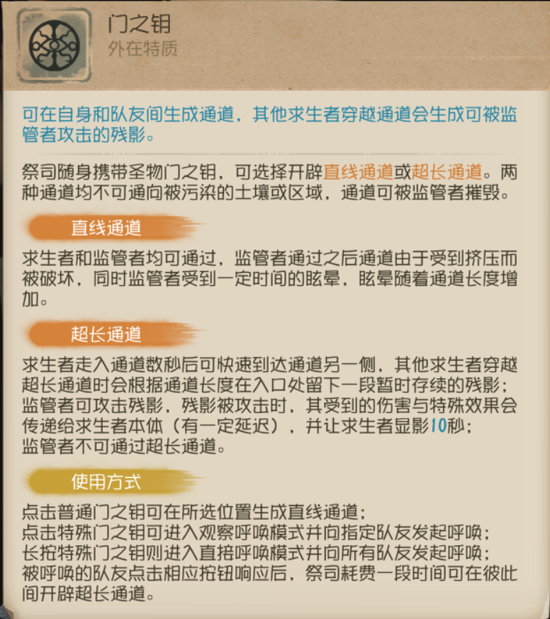 ★实战注意:开辟【超长通道】时祭司不能主动取消技能,不可移动,因此要把握开辟【超长通道】的时机,以免在开辟【超长通道】的过程中受到监管者攻击。