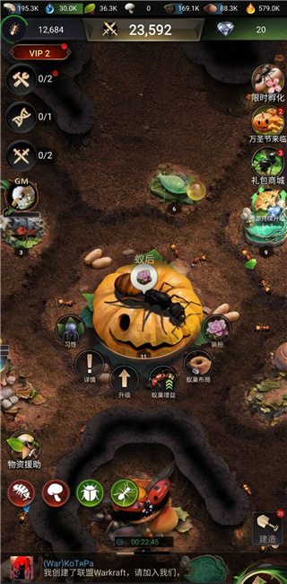 3、存储大量的粮食作为你们的后勤保障,通过训练来升级工蚁的战斗能力。