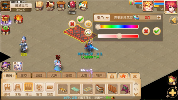 想要对家具进行染色的玩家,在回到家园后,长按已经摆置好的家具,即可看到界面中的“彩色颜料盘”按钮,点击就会出现染色界面。染色界面共有两段染色条,上方的是选择具体颜色,下方的则是调节颜色的深度亮度,玩家可根据自身的喜好以及家具的风格,通过拖动染色条自由染色。需要注意的是,染色需要花费一定数量的花豆,不同家具所需花豆数量不同,如麻布地毯染色需3个花豆,红木八仙桌染色需5个花豆。