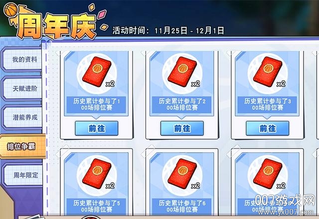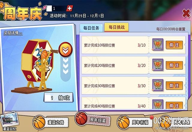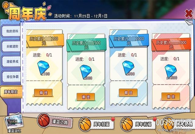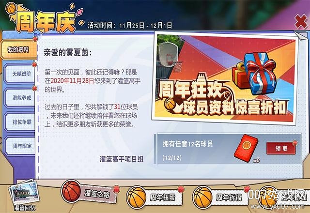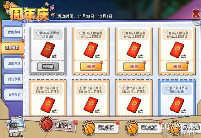 先看一下周年庆的主界面,横向有四大类,然后还夹杂了一个“灌篮回忆”。这个灌篮回忆也是有奖励的。而【灌篮之路】囊括了我的资料、天赋进阶、潜能养成、排位争霸、周年限定五小类。