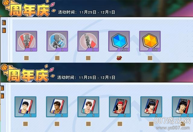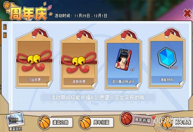 【周年祈福】也是属于必定会拿到的奖励,四个选项,鸿运祈愿是1205蓝钻、15000篮球币、15000竞技币、15000社团币四选一。皮肤祈愿是湘北、翔阳、陵南的球员训练服任选其一或者是40张皮肤属性变更卡。
