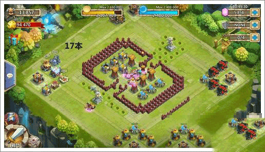 注意这个阵型两个塔之间的金库往里面缩一格,如左边那三个塔一样,不要平行,否则打墙。