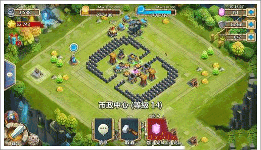 首先,我们要来介绍的是主城的核心建筑:市政中心,这栋建筑并不属于以上三类中的任何一类(还能不能愉快的玩耍了~),它更像是城堡等级的一个象征。而市政中心的主要作用则是通过升级开放更多的建筑类型以及数量,但是其本身并没有特殊的作用。