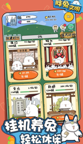 胖兔文明2022最新版是一款以文明发展为题材的休闲挂机游戏,玩家在游戏中将扮演一群胖兔的首领,带领种群发展生产力,战胜敌人,开疆扩土,从石器时代一路发展到工业文明。