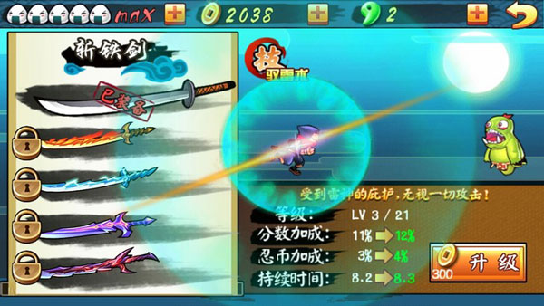 斩雷剑是我们有金币以后的目标,开启技能后全屏的攻击可以消灭一切威胁。而且高额的属性加成也让我们过关变得更容易,性价比极高。