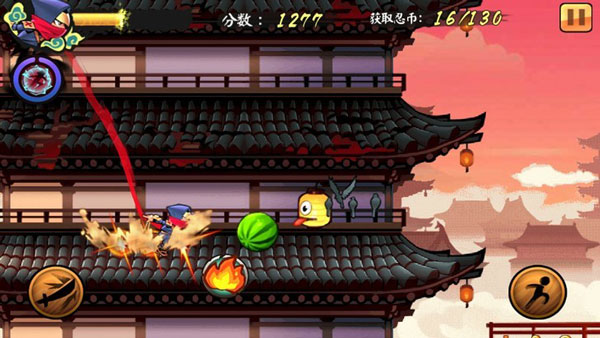 1、想要过关就不能死亡,左上角有我们的体力条,消耗完毕我们就会死亡。体力条会自动消耗一部分,受到伤害也会被消耗一部分。砍西瓜可以增加体力。在游戏过程中二段跳是一个很需要技巧的东西,看到怪物我们用剑去砍,而遇到不能攻击的障碍则要用跳跃来躲避。一般只用一段就可以,在危机的时候二段可以报命,所以多一段跳就多一条命。