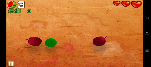 1、一个全新的三滴血设置:原来的3个红叉叉成了“靴猫”的3流血,每掉一个水果就掉一滴血。