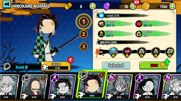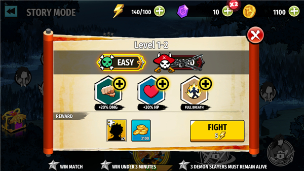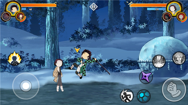 游戏玩法跟火柴人系列手游差不多,只不过是人物是鬼灭之刃人物及技能,不同的是玩家可以携带3个角色进入,可以自由切换它们,你可以灵活切换搭配技能释放连招,