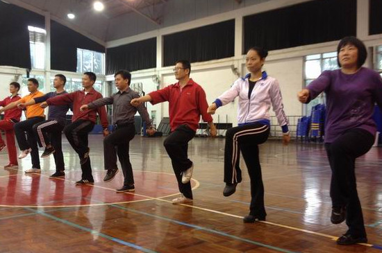 原地踏步走在听到走的口令后,先抬左脚摆右臂,两脚在原地上下起落,抬脚时脚尖自然下垂,落下时前脚掌先落地,走动时上身保持直立状态,两臂按照跑步摆臂的要求摆动,听到立定后立即收手落脚停止动作。