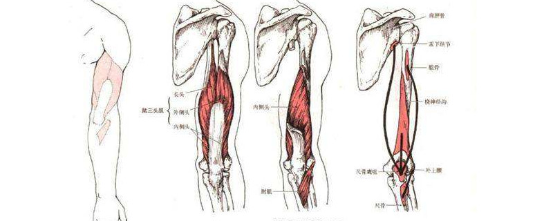 肱三头肌是指从肩胛骨关节孟下方到肱骨表面,是手臂上力量最大、体积最大的肌肉群,肱三头肌又被分为长头、外侧头、内侧头三段肌肉群。长头肌肉的起点是肩胛骨上侧,外侧头的是肱骨桡神经沟上方,内侧头的是桡神经沟内侧下方,三者组成肱三头肌。