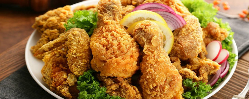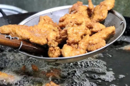 3、起锅烧油至五成热后,放入鸡肉改小火慢炸,炸至金黄色后翻面,每面炸7分钟左右,炸好后就可以捞出蘸取番茄酱或其它酱料吃。