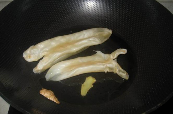 2、往锅内的适量水并大火煮开后,往里面放入姜片、葱段,之后把泡好的干鱼胶放入锅内焯烫,同时往锅内滴入几次料酒。