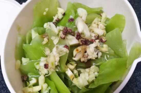 最后将生抽、酱油、白糖、已经切碎的蒜沫倒在莴笋上,之后把莴笋跟调味料抓均匀,大概抓5分钟左右就可以了。最后用保鲜膜将盆封起来,避免灰尘掉入,这样腌制3~5天之后就可以食用了。