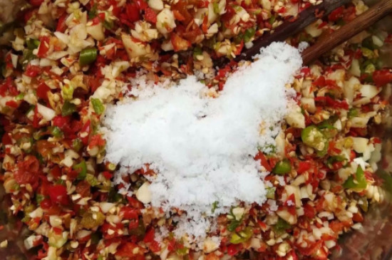 热锅烧油之后倒入搅拌好的小米椒,往锅里加入适量食盐、味精、甜面酱、白糖熬煮,注意油一定在六分热再放辣椒,这样能煸出香味。