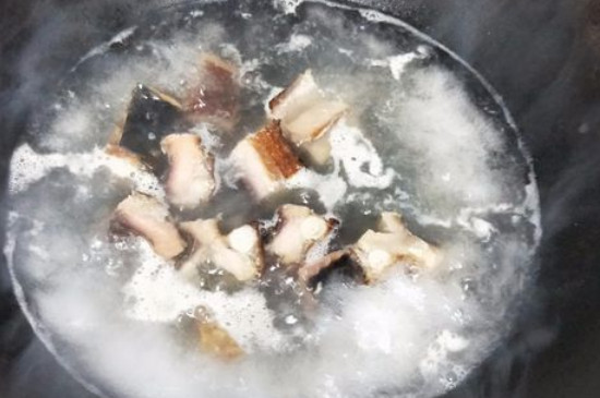 提前将腊鱼切成小块备好,在锅中倒入干净的水,开大火将水烧开。把鱼块倒入烧开水中,煮5~10分钟,捞出沥干。