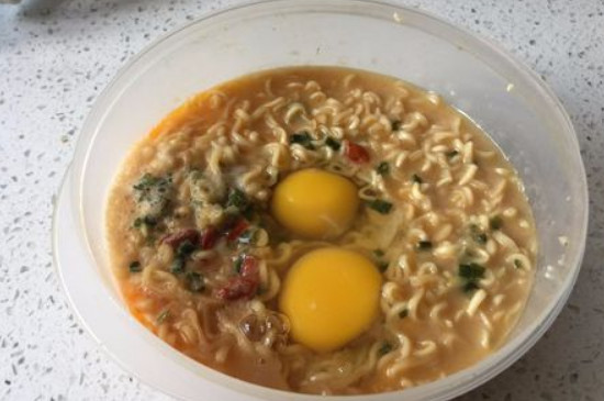 加热取出泡面之后,加入两个鸡蛋并继续放入微波炉内加热,加热一分钟之后就可以取出泡面。最后加入一些喜欢吃的食材,如火腿片、芝士、新鲜蔬菜等,并最后一次把泡面放入微波炉内加热,充分吸收香气就可以食用。