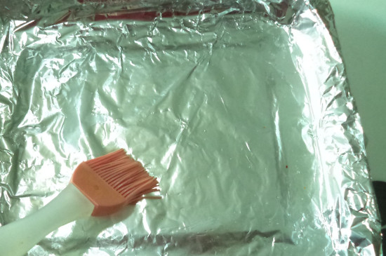 先准备好烤盘,同时为了避免粘盘的情况,最好先在烤盘上铺一层食用性锡纸,然后在锡纸上刷一层食用油。
