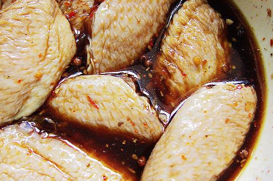 准备需要的食材:鸡翅、料酒、食盐、胡椒粉、老抽、姜丝、白糖、食用油。