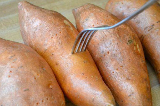 首先将红薯洗干净,沥干水分。用餐叉或者牙签在红薯上刺孔,刺的孔要均匀的分开。在红薯上刺孔可以让热量渗透到里面去,同时不会让红薯产生太大的压力。用餐叉刺孔的时候,建议每个红薯刺6~10次。