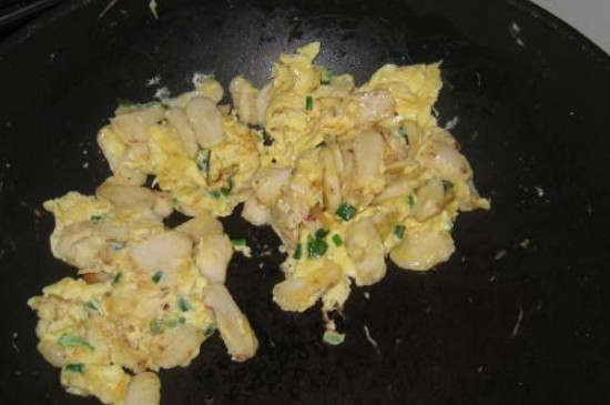把鸡蛋液下锅之后翻炒,将鸡蛋炒至半熟的时候加入切好的荸荠片一起翻炒,等荸荠片颜色变深就可以准备出锅。