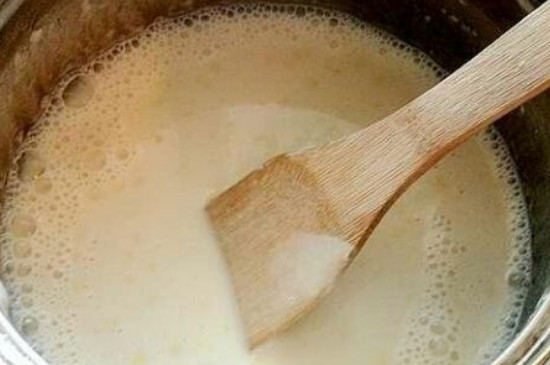 继续不停的搅拌豌豆粉糊,直到面糊变稠之后变白、起小泡为止,此时盖上锅盖焖一会继续小火加热,把面糊煮出大泡后停火。