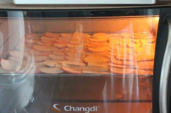 预热完毕之后,把腌制的水果片均匀的放置在烤盘上,放入烤箱之后用80℃~100℃的温度烤制五个小时,中途记得要翻面。