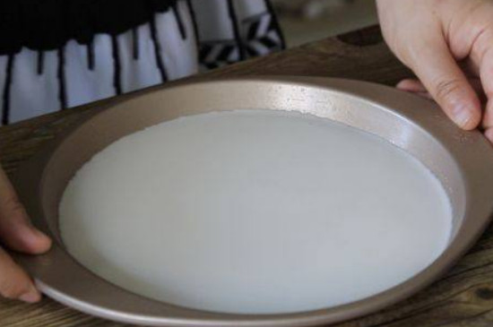 2、在盘子底部刷一层油,往盘内倒入一勺面糊后,摇晃盘子至面糊铺满整个盘子,在放入微波炉内高火加热2分钟。