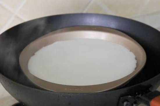 3、取出凉皮,同时轻轻敲开凉皮边缘,冷却至常温后,把凉皮撕下并切段装入碗内。