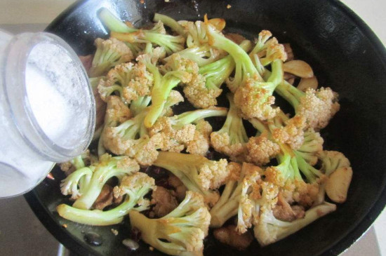 将备好的花菜倒入锅内翻炒,等菜花炒软了之后再放入红椒和青椒继续翻炒。最后放入香菜、食盐之后翻炒五分钟左右就可以出锅食用了。
