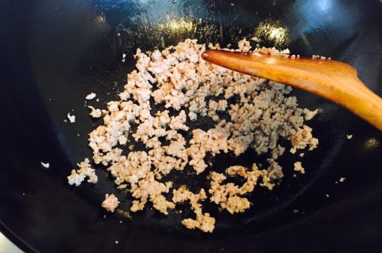 2、将热锅烧油之后,等油热到七八分熟之后,放入蒜末和姜煸香,再放入肉末翻炒至肉末颜色变深。干煸菜花的窍门是烹饪时最好准备一些肉末,如果没有肉末用猪油烹饪也可以,这样用荤菜干煸出来的香味被菜花吸收之后会更香。