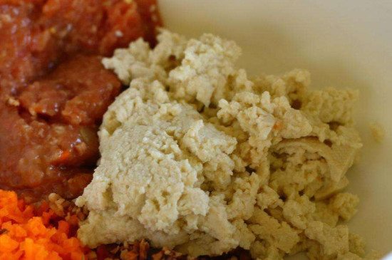 2、将胡萝卜和豆腐碎拌在一起,加入鸡蛋、食盐、酱油,再放入少量的淀粉之后用手搅拌均匀,把面团捏成一个个丸子的形状。