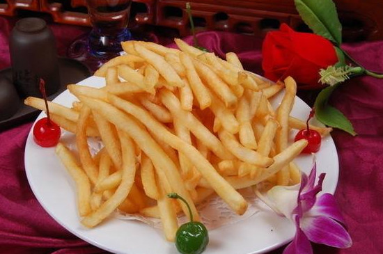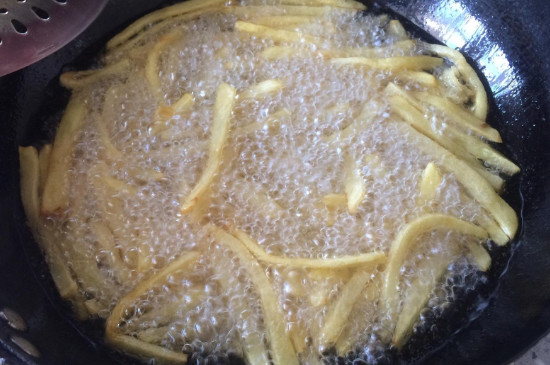 制作炸薯条时先将土豆去皮切成长条状,在低浓度盐水中清洗后放入牛奶中浸泡,或者放入冰箱冷冻,油炸时每间隔一段时间,将其提起来脱离油面上下晃动,避免薯条炸糊或者粘连在一起,炸熟捞起控干油分之后添加适量的食盐即可食用。