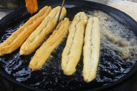 把切好的面块儿两边落在一起用筷子压一下,油条的基本形状就出来了,然后在锅中倒入大量的油烧热,等到油温到达60度左右后,将面块儿拉伸一下后放入锅中油炸,并且用筷子不断的翻动以免炸糊,炸至金黄色后捞出即可食用。