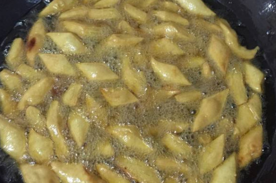 将面团取出后压成面饼,可以用刀划成自己喜欢的形状,注意厚度不要太厚也不要太薄,否则容易把干果炸糊。将热锅烧油之后,慢慢放入面块油炸,直到面块两面都炸至金黄色为止,就可以捞出锅食用了。