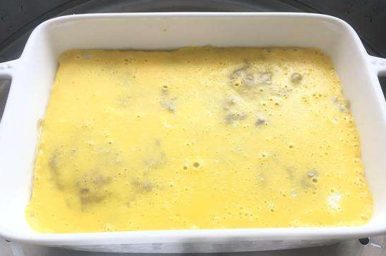 4、最后把肉酱用刀刮平放入蒸笼内,将肉酱蒸成白色之后用毛巾吸收上面的水分,再在肉酱上面加入一层鸡蛋液,放入蒸笼中蒸煮20分钟即可出锅。