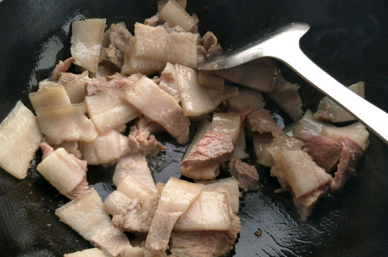 3、烧热锅之后用姜片擦锅,这样可以防止粘锅。将油倒入并烧至半热,加入白糖熬制成焦糖色,放入捞出的猪肉开始上色,最后再加入姜片、葱段、酱油、料酒、十三香、花椒面进行翻炒。