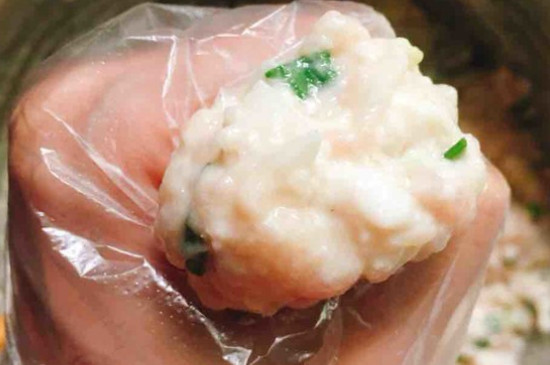 把搅匀的肉馅握在手上,再从虎口处挤出丸子。