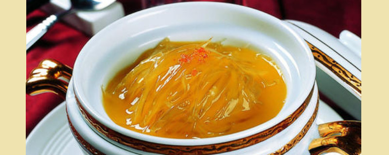 在锅中加入糖、食盐、油等调味料之后炖煮2~3分钟就可以出锅了,把锅中的鱼翅汤兑入淀粉中做成勾芡,浇灌在鱼翅上面,最后撒上火腿丝就烹饪完成。煮鱼翅最好不要用其他味道浓的食材,否则容易遮盖鱼翅的鲜味。