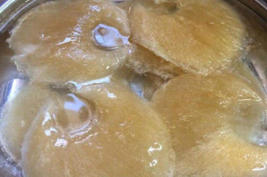 将火腿、葱姜蒜等配料切好备用,热锅烧开水,热水沸腾之后加入姜丝,再把鱼翅放进去焯一遍,过两分钟捞出来就可以了,用生姜水煮主要是为了去腥。烧热锅之后加入清汤和干贝,再将鱼翅倒入之后用小火慢慢煮开。