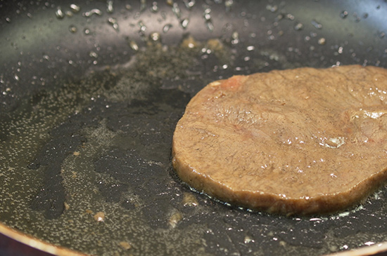 3、起锅烧油,将牛排放入锅中,翻炒至2分钟后,再翻面煎2分钟。