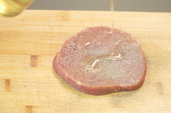 2、再加入胡椒粉,将正反面拍打均匀,再加入适量橄榄油至表面,并涂抹均匀。