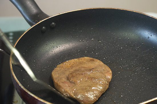 2、起锅烧油,将牛肉放入锅中,翻炒至2分钟后,再翻面煎2分钟。