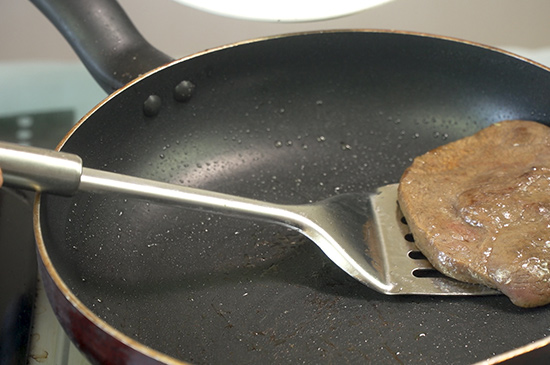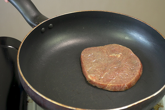 3、将牛排放入锅中,正反两面不断翻动片刻。