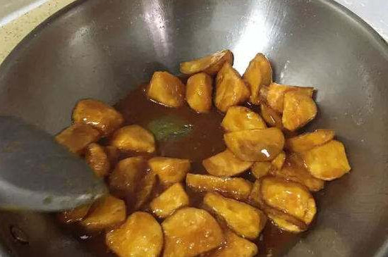 按1:1比例放入白糖和清水,不停地用铲子搅动,使白糖慢慢融化,待糖浆大泡变小泡且变得粘稠,颜色呈焦糖色,这时可以下入炸好的地瓜,然后快速翻炒均匀即可。