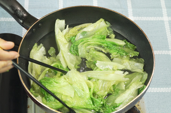 3、往锅内放入生菜焯水片刻,生菜变色后捞出滤干水分装盘。