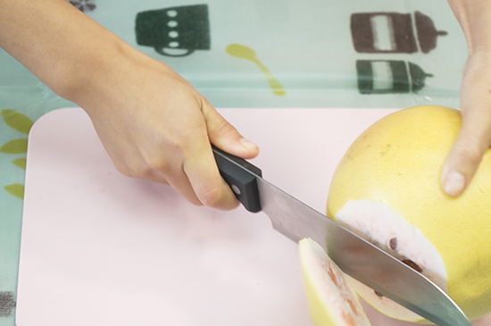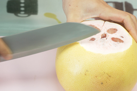 3、西柚顶部划几刀后,沿着刀口向侧面划几刀。